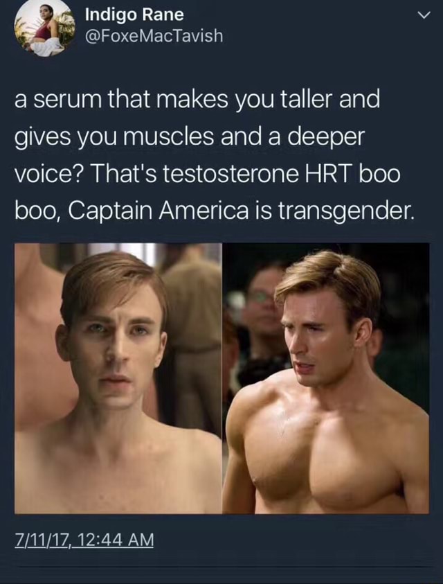 A Serum That Makes You Taller And Gives You Muscles And A Deeper Voice That S Testosterone Hrt Boo Boo Captain America Is Transgender Ifunny