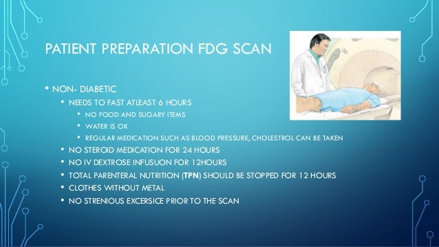 Follow a limited carbohydrate diet for 24 hours before the scan. Diabetic patients may eat up to four hours prior to appointment time Drinking water is allowed and encouraged. If the radiologist believes this is helpful a small intravenous IV line is.