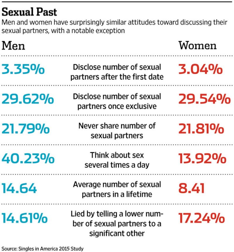 Many people dont know the full story when it comes to their lovers past. Whereas a 25 year old male who has been married for 5 years may have considerably less. It seems on average women have slept with more.