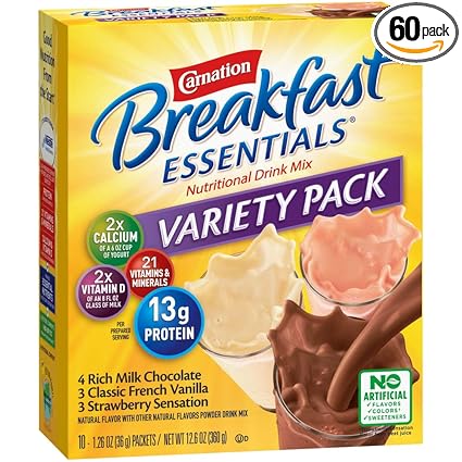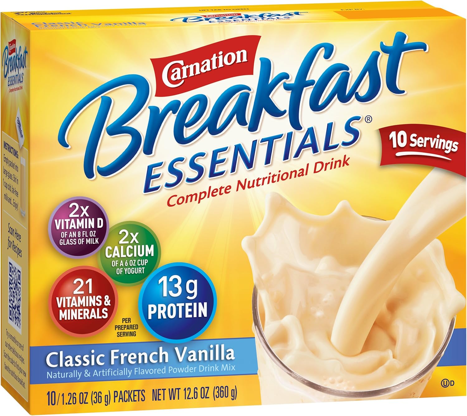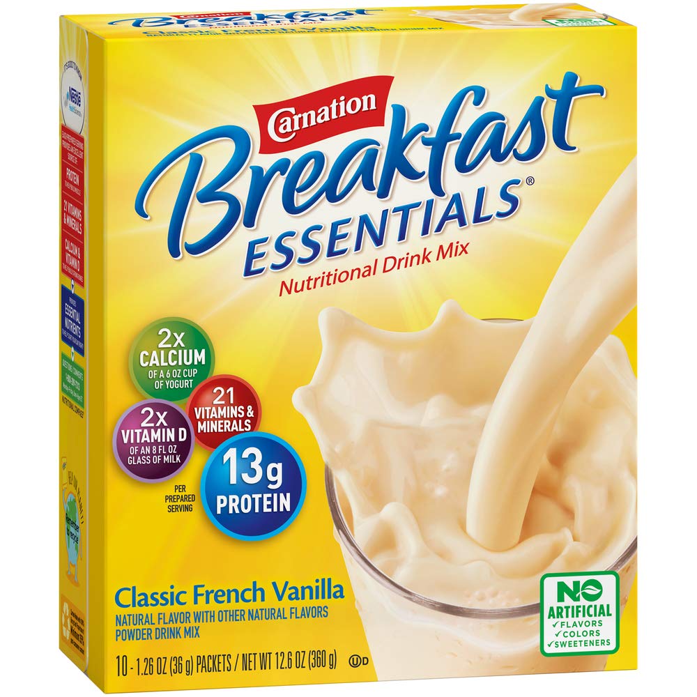 Carnation Breakfast Essentials Powder Drink Mix with Probiotics Classic French Vanilla 10 Count Box of 126 oz Packets Pack of 6 243 31 19 041Ounce. Instant breakfast powder that has 23 essential vitamins designed to boost energy and curb appetite strength of a double shot espresso in just 120 calories 16 grams of slow-releasing protein to stay fuller for longer. It is available in both Powder and Ready-to-Drink products.